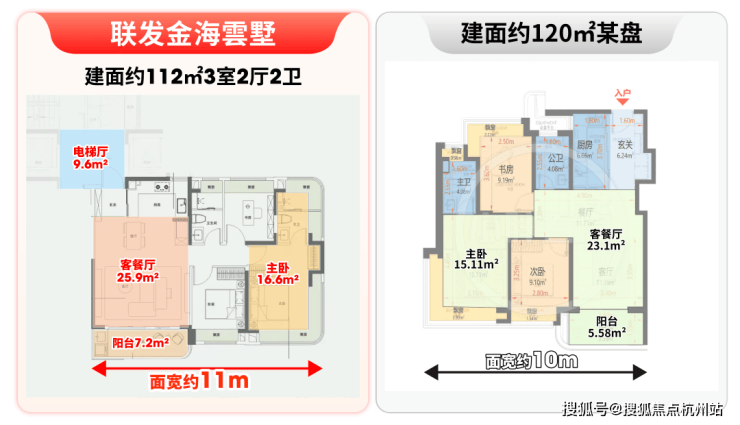说实话,竞品的建面约120㎡也同样非常出众。但即使如此,金海雲墅建面约112㎡的产品依旧在附赠、客厅、主卧、独立电梯厅等维度碾压了他。