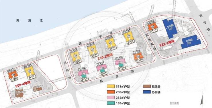 其中E08-4、E10-2、E12-1这3块宅地沿黄浦江一字排开,坐拥黄浦江核芯段岸线。