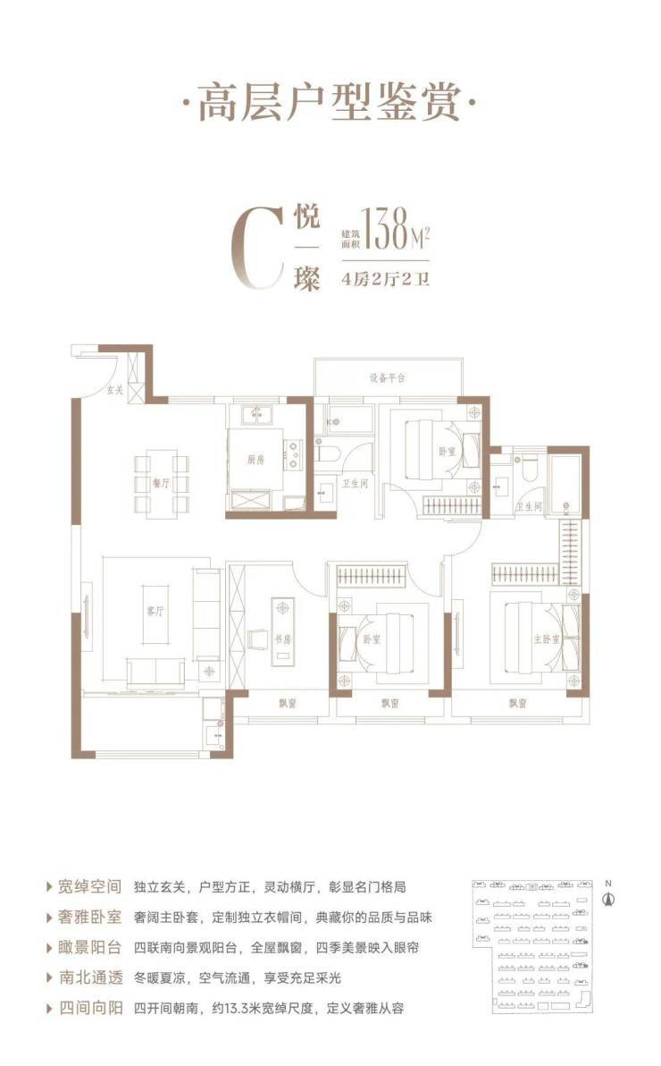 建面约103-138㎡瞰景奢装高层,同样令人倾心。建筑南向大面宽开间,最长达13.3米的尺度,南北通透,阳光清风满怀;主卧套房、U型厨房、精致餐客厅……通过宽绰空间与人性化的功能分区设置,重新定义品质生活。这不仅是空间的迭新,更是景观与圈层价值的双重叠加。