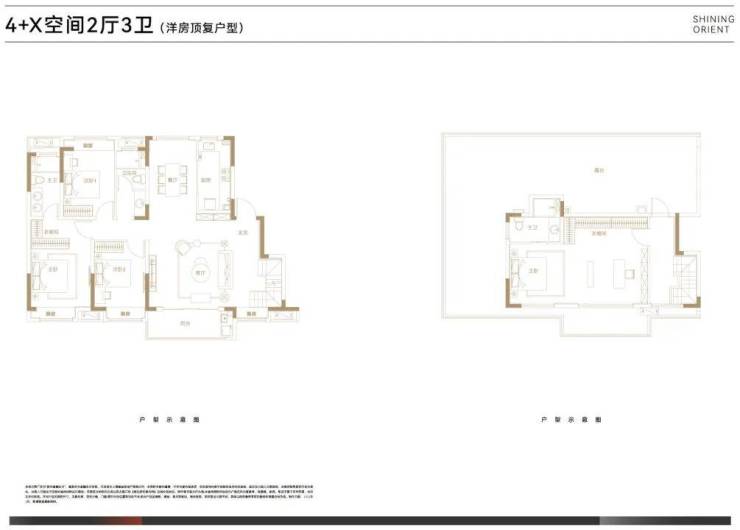 叠墅总高四层,设计了邻里空间,单元门设计也是非常的大气。上叠125㎡三房两厅三卫,顶楼闷顶层等可以拓展空间;下叠140㎡四房两厅三卫,另有超宽裕的赠送面积。