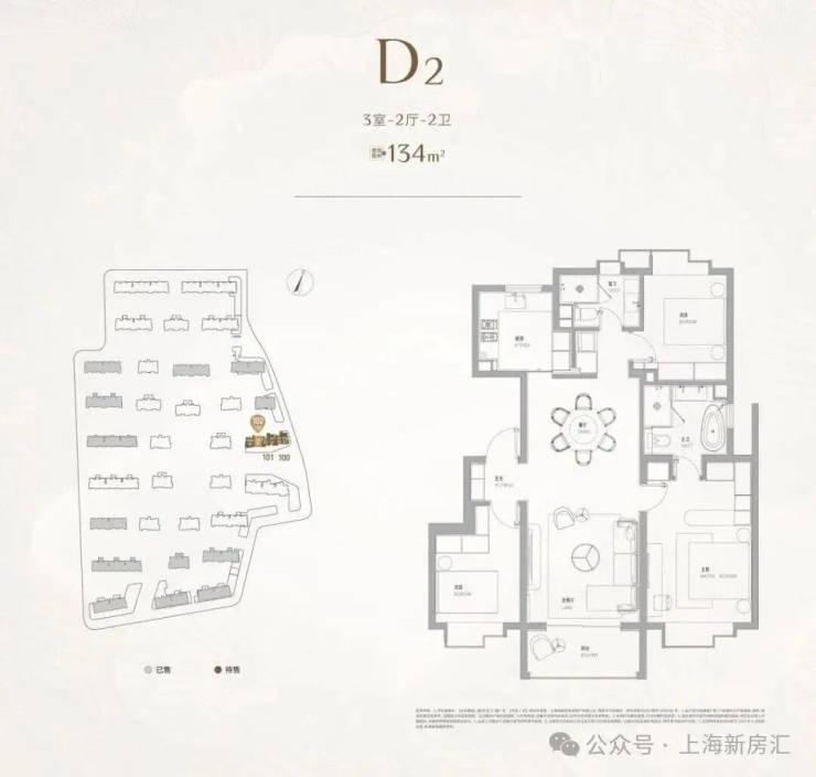 建面约134㎡3房,几乎可以看做是双套房的设计,尤其是主卧带浴缸和双台盆,保证了各个家庭成员的私密空间,适合一家三口的改善之选。