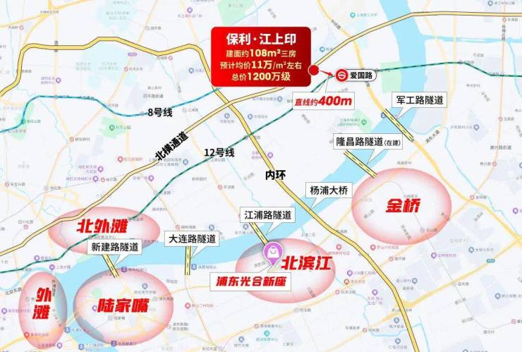 再加上内环和五条过江隧道(包括桥)的加持,像杨浦滨江核心区、北外滩核心区、陆家嘴、世纪公园、南京西路、外滩等都是业主未来的生活圈