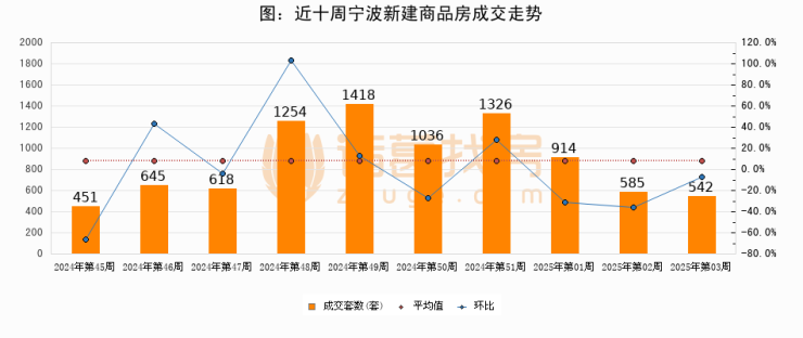 进入2025年第03周(01月13日-01月19日),宁波新建商品房成交542套,较上周减少43套,环比下降7.3%