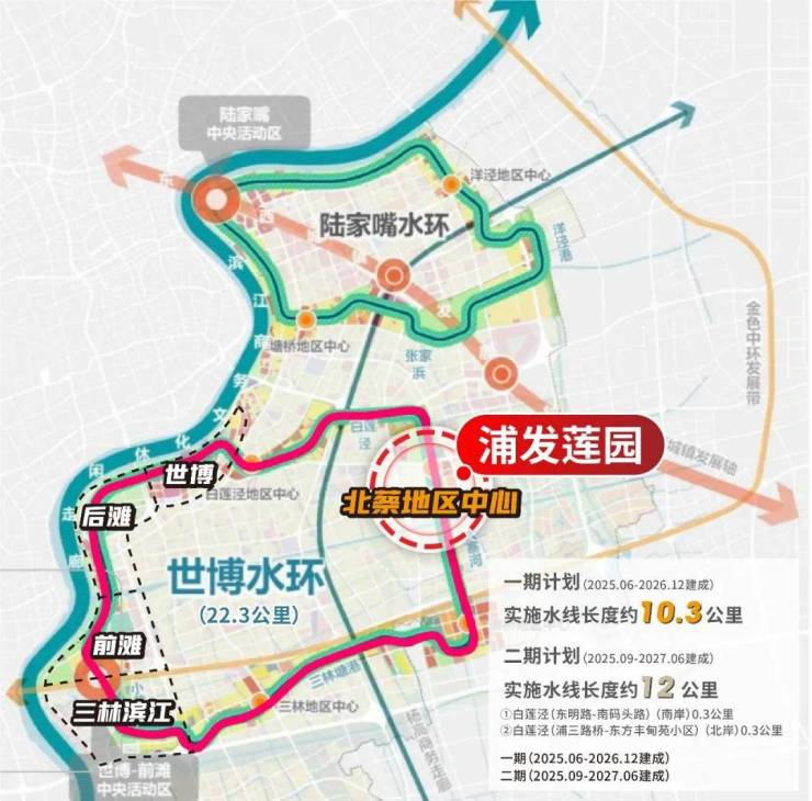 这其中,世博水环是区级层面最重要的规划,它是陆家嘴水环的全面升级版(Plus版)——规模更大、能级更高、功能更全、生态与烟火气更强,是浦东滨水开发从“1.0金融商务”迈向“2.0人民水岸”的标杆。