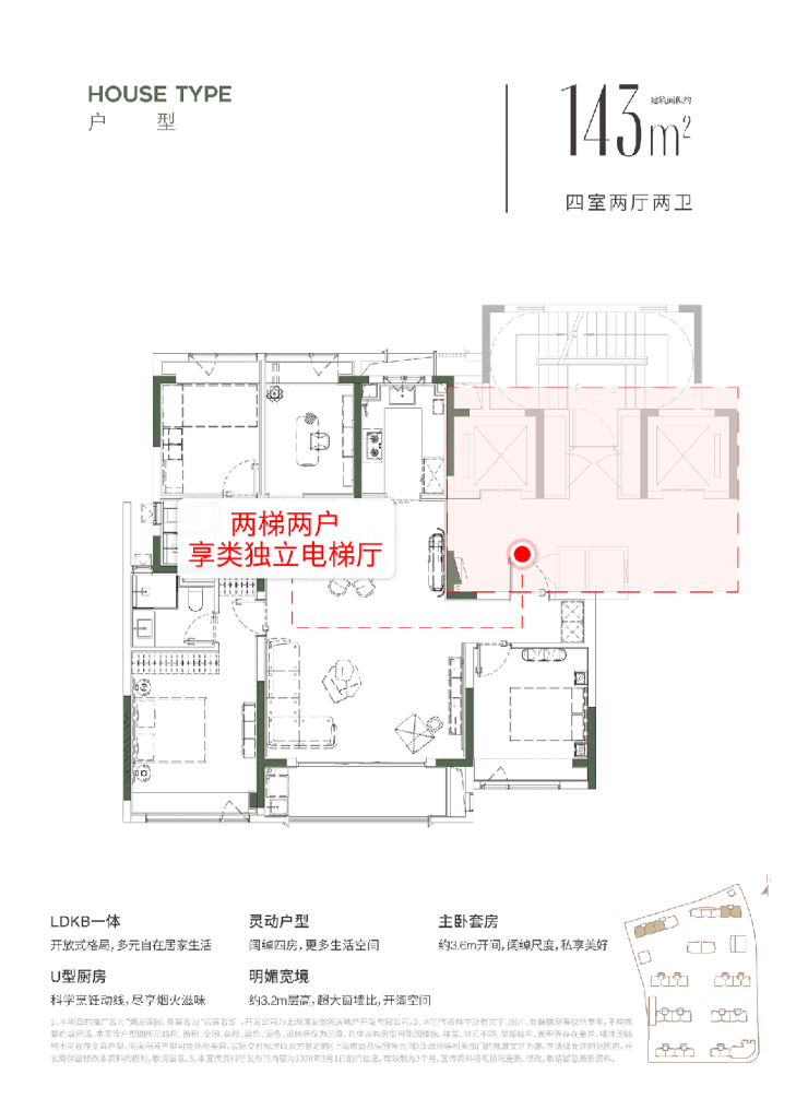 建面约143㎡,四房两厅两卫配置,匹配二胎家庭或三代同堂需求。
