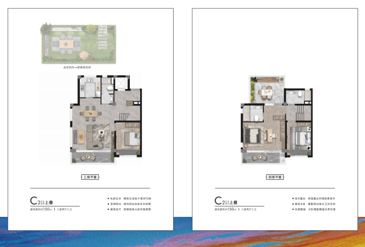 建面约150㎡3-4房 这个面积段的叠加空间更加富裕,空间打造上也更加灵动。主卧带观景阳台的设计,让四季景观尽收眼底。