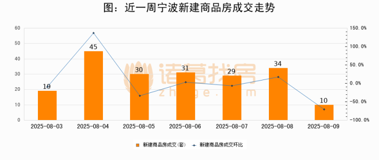 根据宁波市房产市场管理中心数据显示,2025年08月09日宁波新建商品房成交10套,较昨日减少24套,环比下降70.6%
