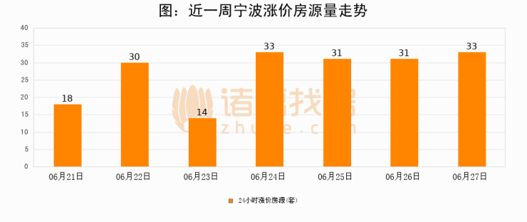 根据诸葛找房数据显示,宁波24小时涨价房源量为33套,较06月26日增加2套,环比上涨6.5%。与此同时,涨价房源占比小幅扩大,业主信心有所提升。