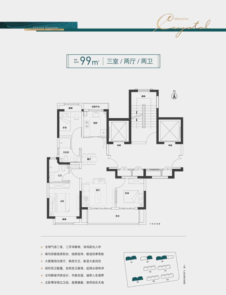 约99平三室两厅两卫为主力户型,三开间朝南,全明设计,南北通透;约6.3米大面宽阳台,视野、光线双丰收!