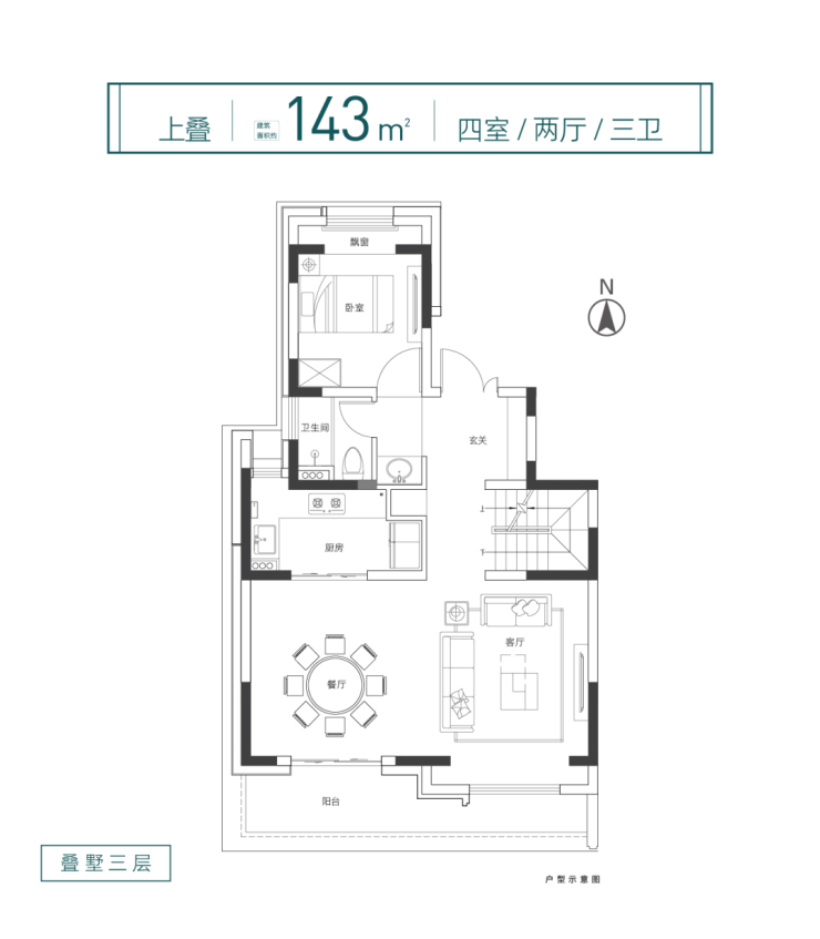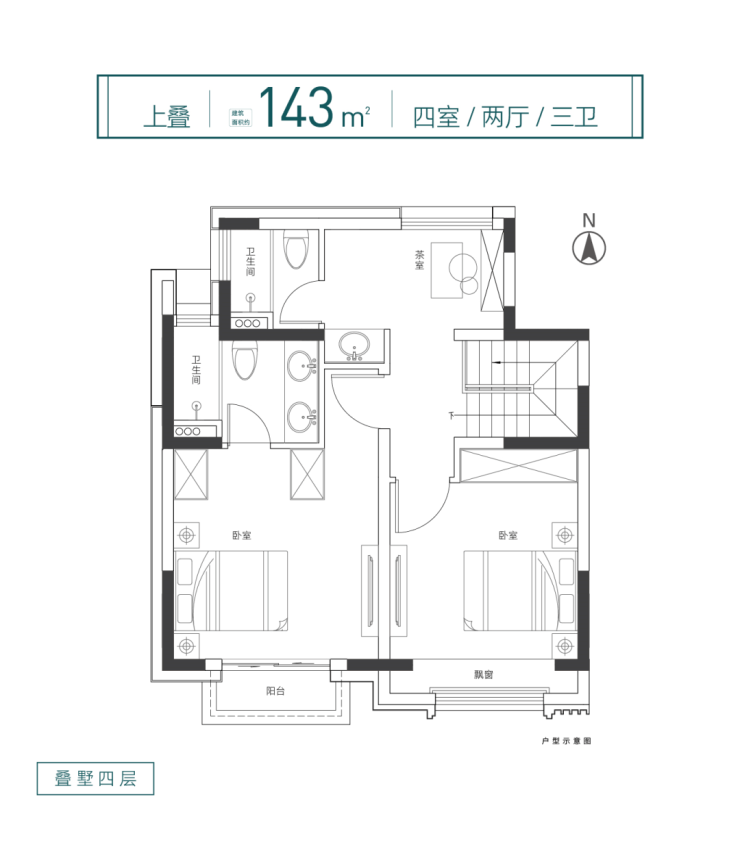 约143平4室2厅3卫上叠、约153平5室2厅3卫下叠,格局方正阔气,约7.3米大面宽双厅,尺度非凡,配合大面宽阳台设计,光线俱佳。