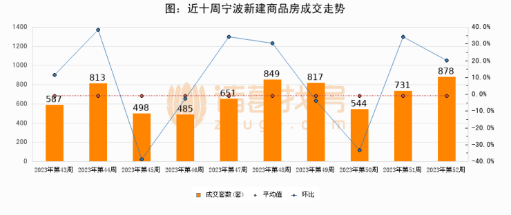 进入2023年第52周(12月18日-12月24日),宁波新建商品房成交878套,较上周增加147套,环比上涨20.1%