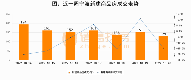根据宁波市房产市场管理中心数据显示,2022年10月20日宁波新建商品房成交129套,较昨日减少22套,环比下降14.6%