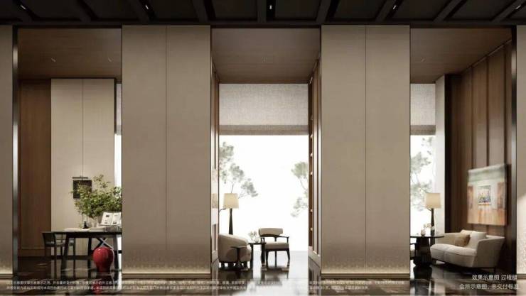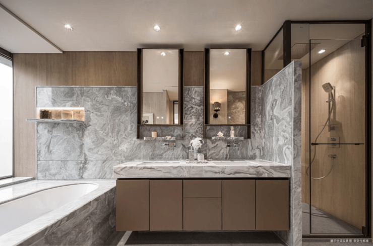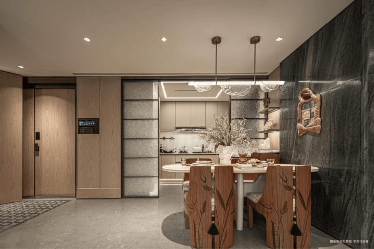 墙面,严选安第斯雪或晓山青珍贵石材,与木饰面、特色定制墙布组合设计;客厅、餐厅、卫生间等区域地面定制石材,赤足走过,温润细腻的触感。