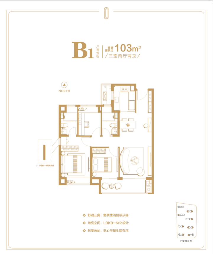 采用LDKB一体化设计,大面宽短进深,南北通透,全景飘窗+观景阳台引入采光与景观