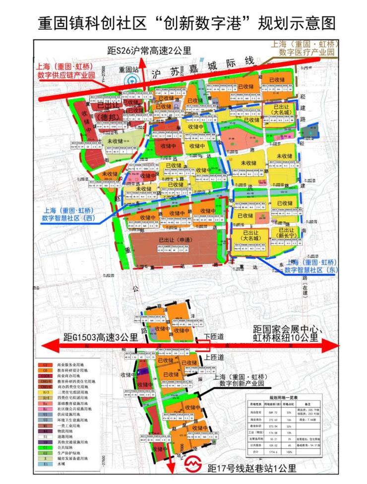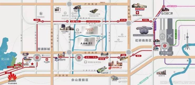 通过17号线乘坐6站即可直达虹桥商务区和虹桥枢纽,可无缝换乘2号线、10号线抵达全市各大主要商圈,距离崧泽高架入口约1.5公里3分钟可直达虹桥商务区和虹桥枢纽,向南自驾约5公里可上沪渝高速,沪渝高速是目前西上海最重要的高速公路,通过高速往东直连延安高架通达市中心,沪渝高速往西可到达吴江嘉兴等环沪城市。未来衔接示范区线赵重公路站直线1公里,步行约1.5公里的距离。