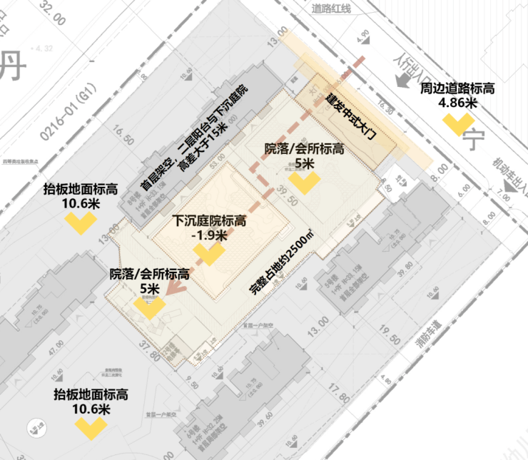 可以看到,周边道路的标高,在4-5米的范围内,但是整个社区地面的标高来到了10.6米,而单元楼首层的地面标高,来到了10.75米。