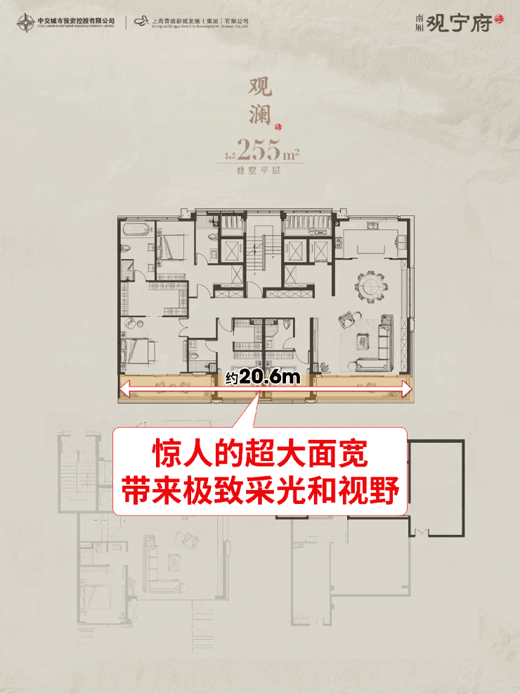 建面约255㎡平墅,豪奢南向面宽高达约20.6米,惊人的超大面宽,带来极致采光和视野。