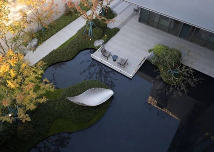 △曲线线条切割石材,设计灵感来源于水的波纹,用无垠的草坪呈现水景,置石为扁舟,别有一番意境。