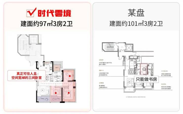 而得益于双约270°转角飘窗+南向双阳台的设计,时代雲境建面约97㎡产品,做到了3个卧室都能住人的“真三房”成交。