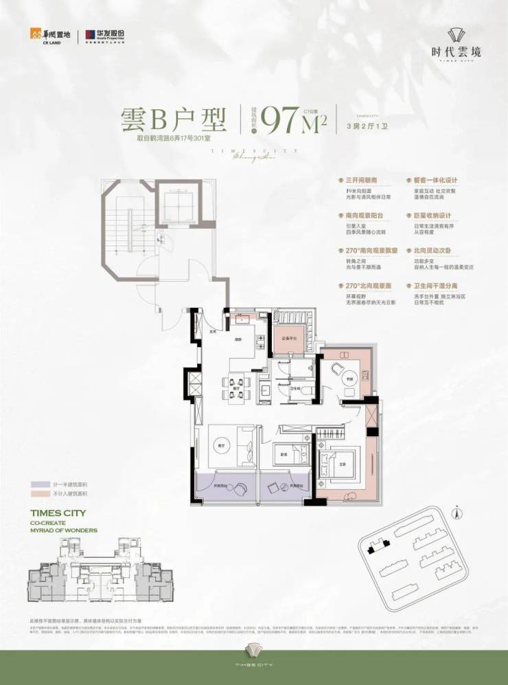 时代雲境建面约95-97㎡的房源不仅是边套,还设计了270°南北双转角落地窗。