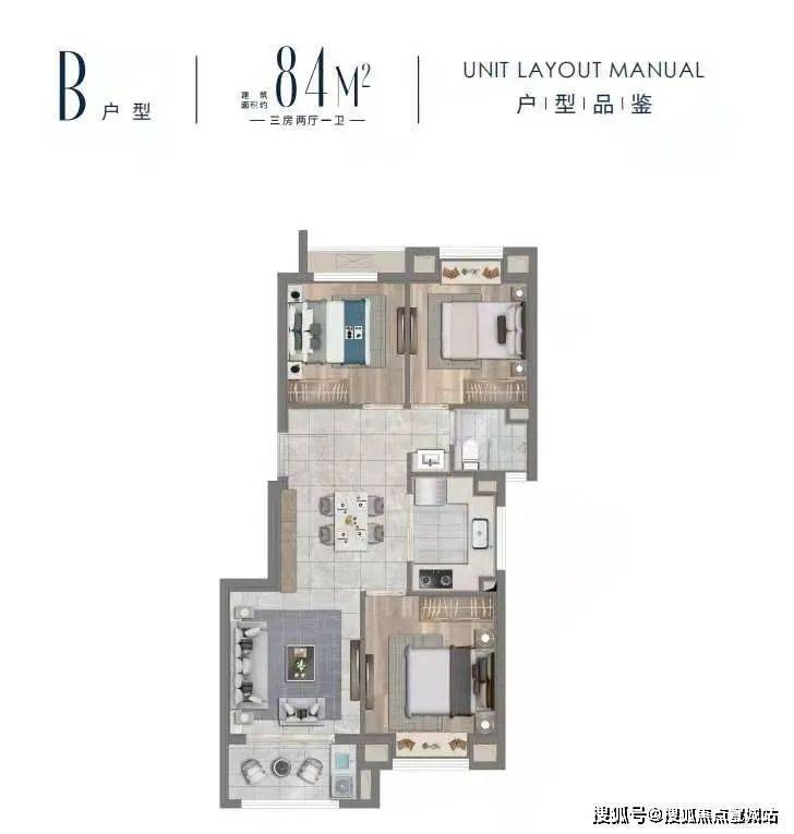 B户型建面约84㎡三房两厅一卫▼