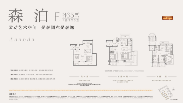 建面约165㎡下叠预计使用率最高约148%、地下室三面采光、LDKG双入户流线、南北通透主卧套房。(注:非得房率,最终房屋得房率以实测报告为准)