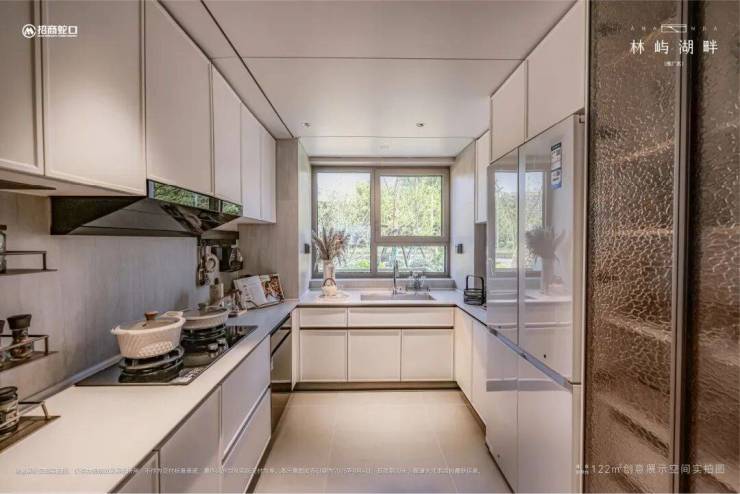 U型厨房借用飘窗,带来远超普通户型的操作空间,可收纳锅碗瓢盆、五谷杂粮,吊柜安装天使拉篮方便拿取;方太三件套,更适应国人的烹饪习惯。