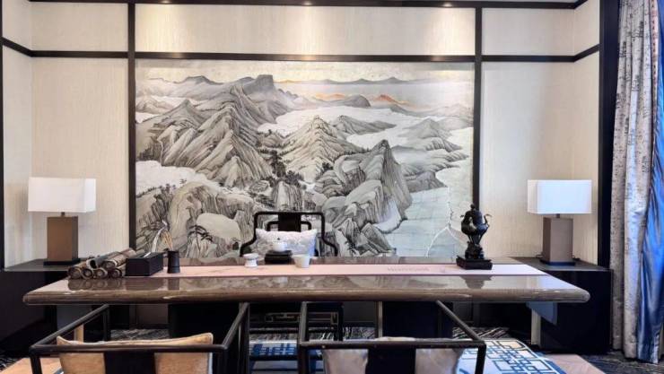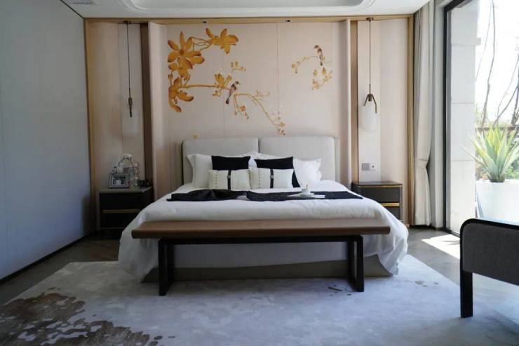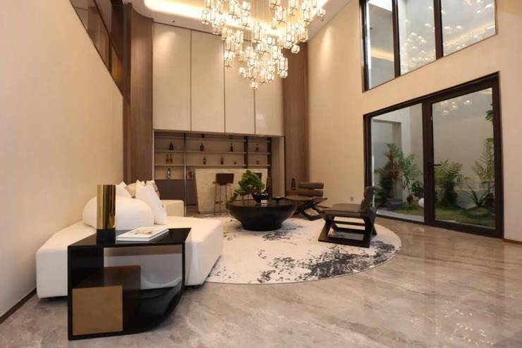 通过优化后的“L型”空间排布,实现了三面有园林环绕,前庭空间尺度非常大,一进门就是约10.2米的大横厅,气派十足,采光也做到极致,日常起居极为从容舒适。