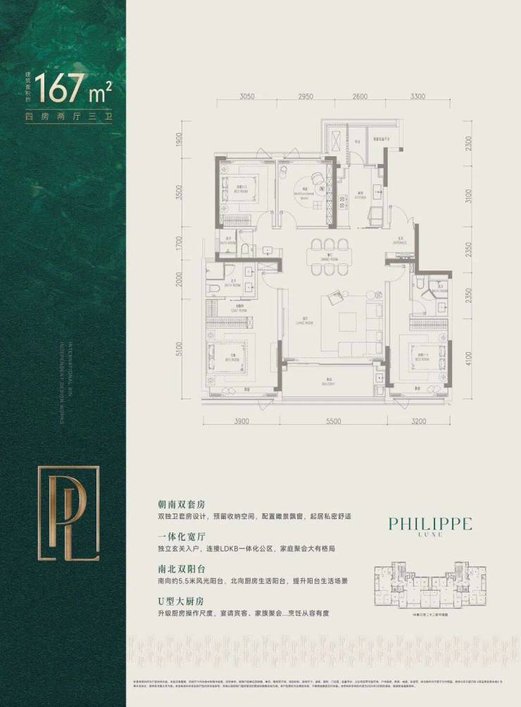 建面约167㎡四室两厅三卫:均价 39500 元 /㎡,总价约 545-687 万,南向横厅,双主卧套房设计
