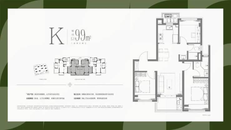 实现了大面宽横厅的飞机户型设计,使得南向的开间,全部布置为客厅、主卧和次卧三个最重要的功能区;北向房间则布置了次要的厨房、次卫、书房和主卫功能,最优化的提供南向面宽和缩窄户型整体进深,提升户型整体的采光和通风。