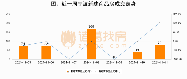 根据宁波市房产市场管理中心数据显示,2024年11月11日宁波新建商品房成交79套,较昨日增加40套,环比上涨102.6%