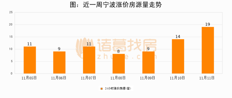 根据诸葛找房数据显示,宁波24小时涨价房源量为19套,较11月10日增加5套,环比上涨35.7%。与此同时,涨价房源占比小幅扩大,业主信心有所提升。