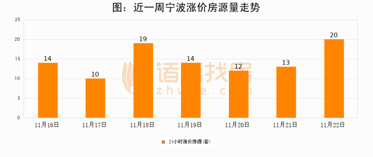 根据诸葛找房数据显示,宁波24小时涨价房源量为20套,较11月21日增加7套,环比上涨53.8%。与此同时,涨价房源占比小幅扩大,业主信心有所提升。
