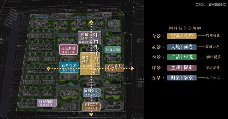 以江南人文精神为源点,打造两轴一环五进空间,江南礼序归家轴串联启迎盛礼、筑阙会友、归家华堂等5重礼制,尊崇归家;健康运动轴以24小时跑道为社区活力生活环,串联儿童乐园、长者康养、疗愈花园等10大生活场景,营造全龄全时的江南诗意生活