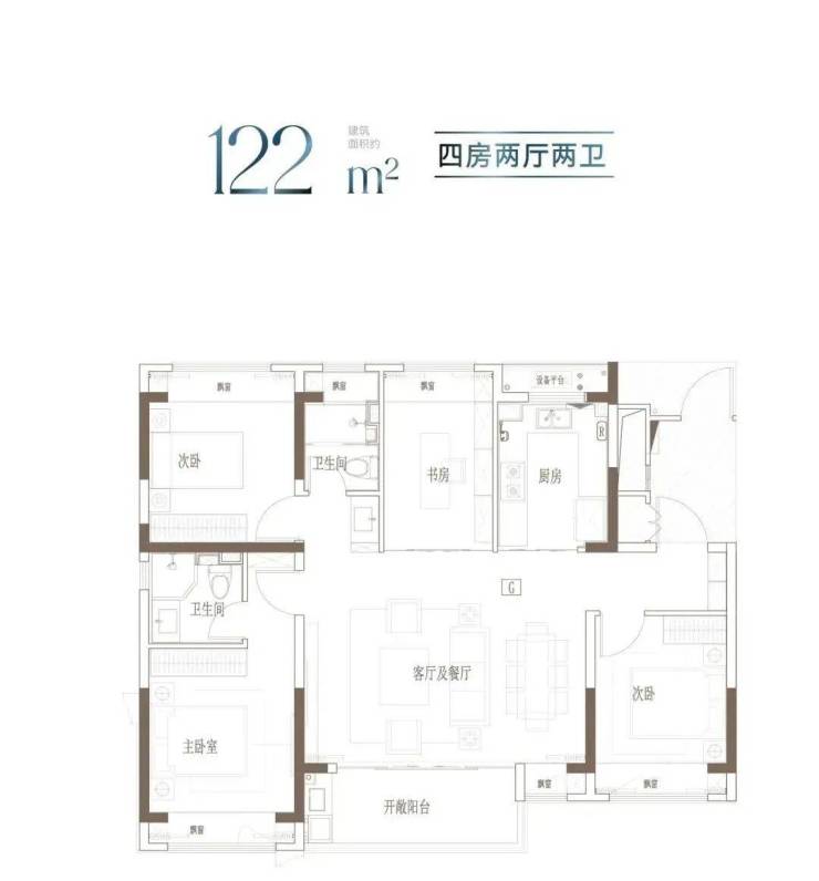 户型特点:宽境4房,拓宽空间尺度;大开间、进深短,通透采光;主卧独立卫浴,优雅随心的寝居感受。