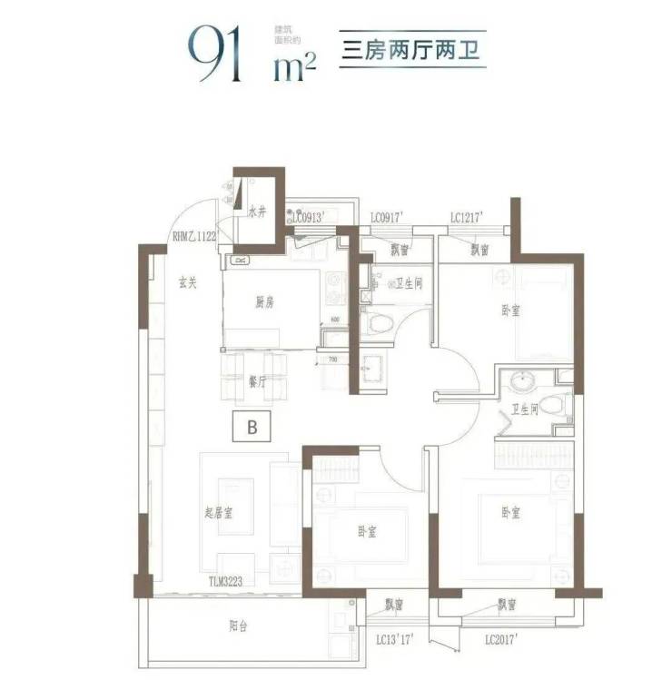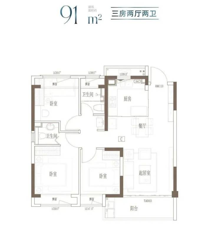 建面约91㎡ 3房2厅2卫▼