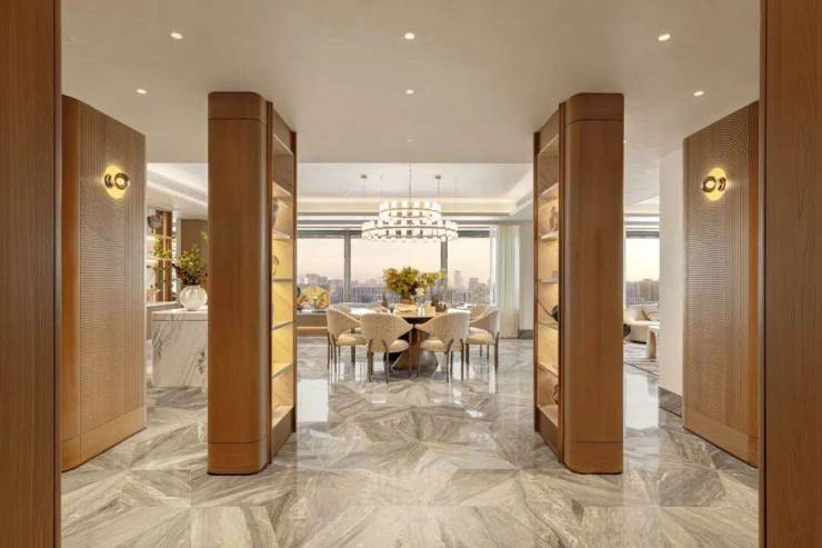 万科中興傲舍凝聚72种高端豪宅都难得一见的奢材,如皇家白奢石、Prada绿皮革面奢石、砖纹定制铝板等等,每一处细节都透露出精致与考究。