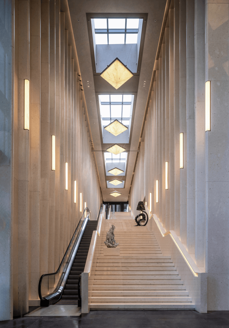 比如,艺术感与质感并存的车库,以及全石材地面铺装的车库大堂。