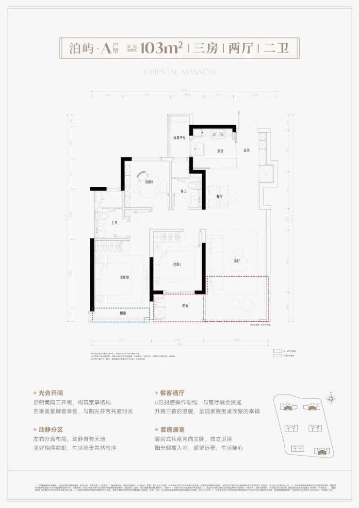 南向三开间朝南,约9.8米大面宽,约7米阔绰阳台,餐客厅贯通,并连接阳台,百变待客空间;套房式主卧,南联阔景飘窗,栖居更温馨舒适。