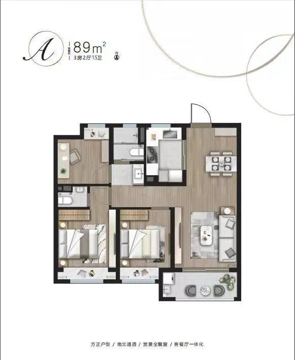 90㎡三室两厅:南北通透,全明格局,适合刚需上车