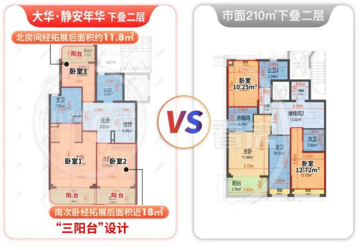 而同级常规叠墅要么双面宽全给客餐厅,但面宽仅5.5-7米;要么采用南向客厅+卧室布局,客厅面宽仅约3.5米。