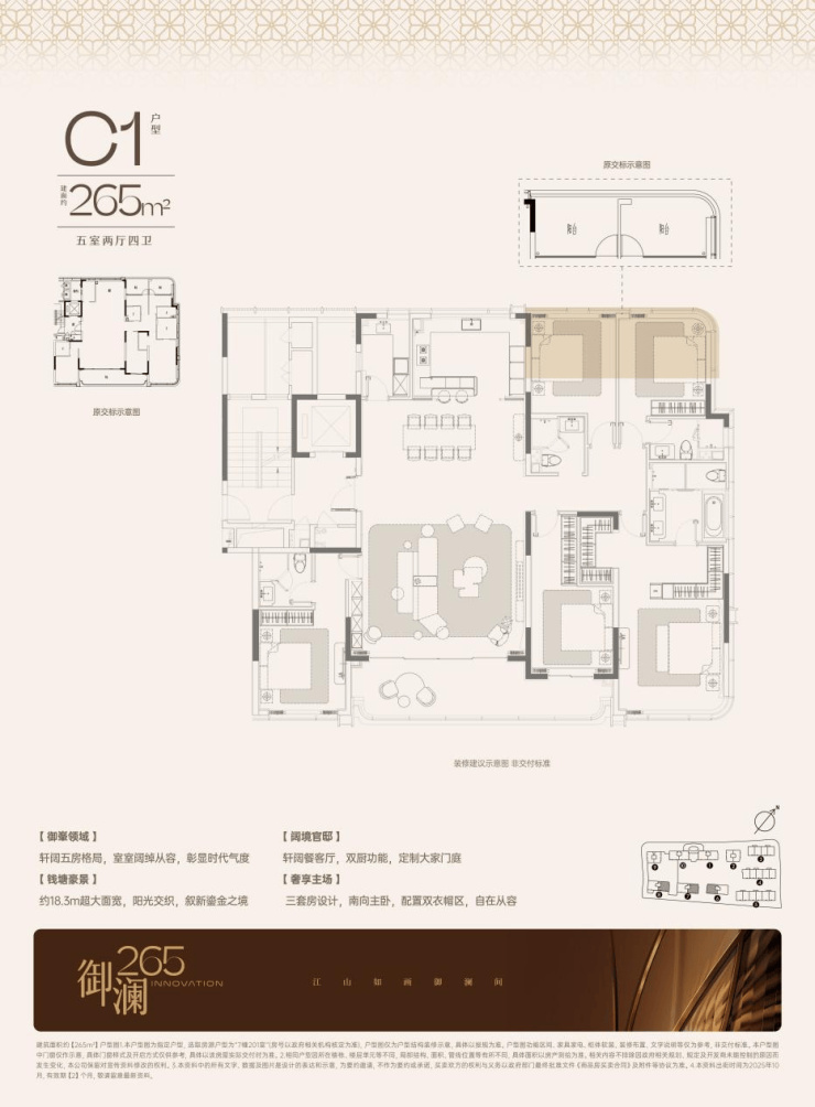面对如此卓越的天赋,天澜传序府也把最受市场欢迎的建面约265/268㎡放在了6号楼。其中建面约265㎡户型四开间朝南,整个面宽达到了惊人的约18.3m,而建面约268㎡户型更是配合豪宅仪式感,在入口处打造了帕拉第奥十字圆厅,客餐厅边上连着一个以弧形落地窗围合的X空间,从大五房设计,三套房规划,直至专属的独立家政空间,无论是建面约265㎡还是约268㎡都绝对是塔尖最顶级圈层的不二之选。