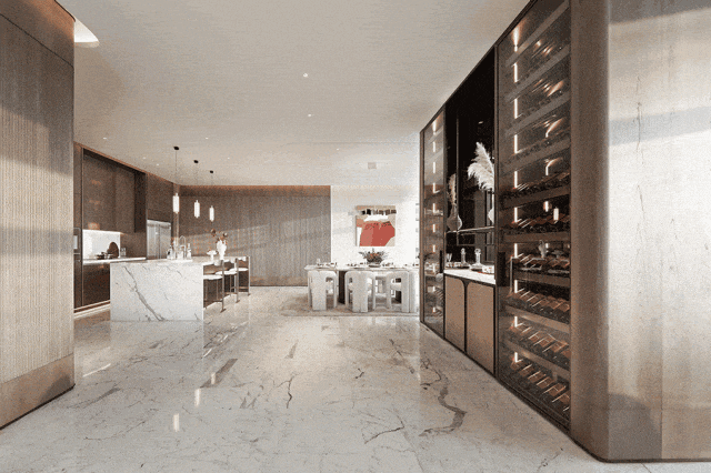 F+P的顶级豪宅设计经验与顶级酒店设计王者HBA的奢华体验,碰撞出全新灵感,尽呈登峰造极的顶豪E户型样板间。眼前尽是壮阔景象,客、餐、厨一体设计,呈现比排球场还大的无界奢厅,大气卓越。它以大岛台为枢纽,营造硅谷精英式的社交生活,也尽可满足名流酒会、家族宴会,亦或是董事会议的临时场所。