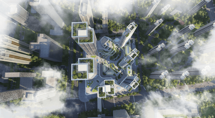 项目定位:约50万㎡超大体量的“工作+生活+娱乐”未来微城市综合体,融合200米摩天双塔、顶奢江景大平层、总部办公与国际商业