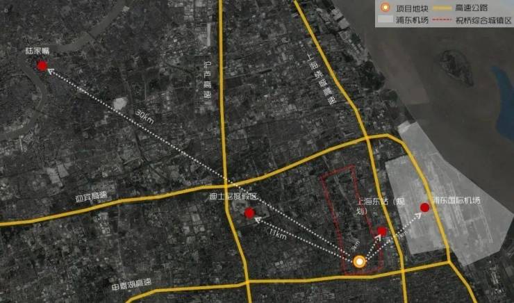 「森兰海天名筑」基地位于祝桥城镇区,虽然距离上海市区较远,但紧邻浦东国际机场与上海东站新址,距迪士尼度假区直线距离仅有10km左右。在城市规划层面属于祝桥生态居住区核心位置,宏观上四周有临空产业片区,上海东站,生态保育片区,度假休闲片区,规划前景不可限量。