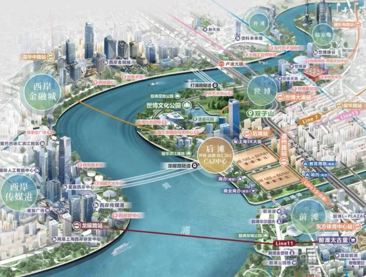 商业方面,项目北有世博天地,南有前滩太古里,对岸还有西岸梦中心和西岸金融城,随便一个都是全球城市顶流商圈的级别!