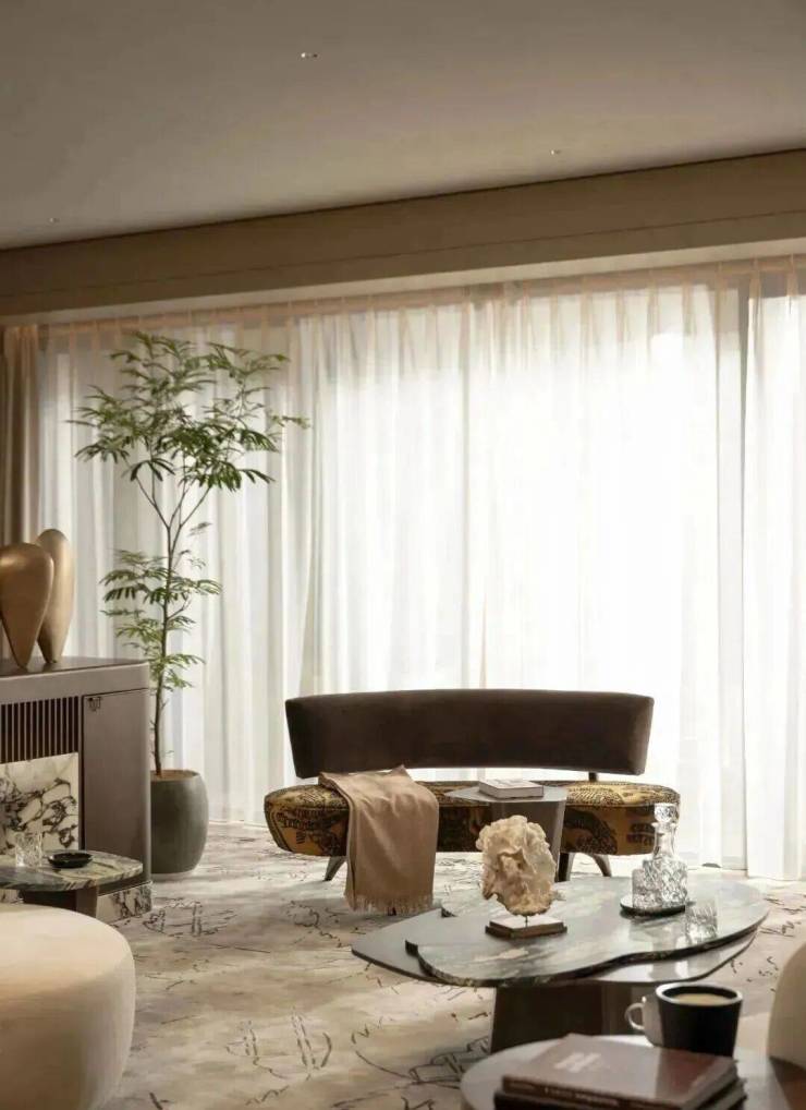 以黄浦江为灵感,营造“阅尽千帆后的宁静与松弛感“!通过8.5米南向宽厅、270°环幕玻璃、无冗余装饰的减法美学,让空间如江面般舒展,视野极度开阔!