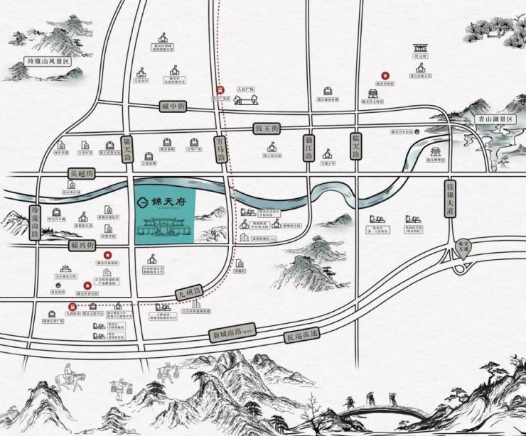 锦天府择址临安锦城、锦南繁华交汇处,东靠狮子山,与吴越街为邻,杨岱溪贯穿园区,犹如玉带环腰,左右逢源