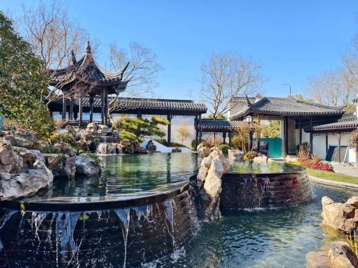 在手法上,汲取江南造园精髓,复刻水乡记忆,在园林中叠山理水,复兴中国文化高峰时期的宋韵美学,打造亭台楼榭、小桥流水,营造出了江南中式步步尊崇的三重归家礼序