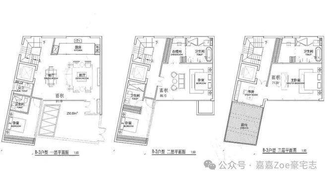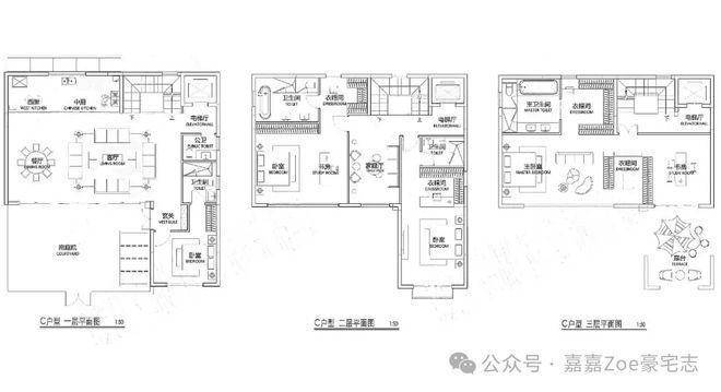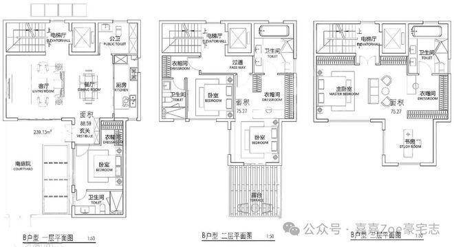 二楼双套房设计,三楼主人套房设计,开放式书房空间,通往露台。